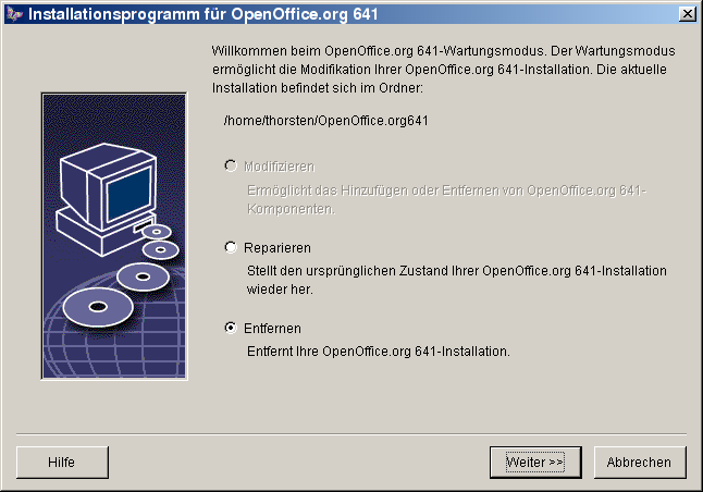 Rufen Sie nach der Installation von OpenOffice.org das Setup Programm erneut auf, bietet es Ihnen in seinem ersten Dialog die Möglichkeit, Ihre bestehende Installation zu ändern, zu reparieren oder sie ganz zu entfernen.