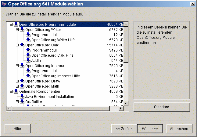Nicht installierte Teile von OpenOffice.org sind durch graue Kästchen markiert. Klicken Sie auf ein graues Kästchen, so wird es farbig und zeigt damit an, dass diese Komponente zusätzlich installiert wird.