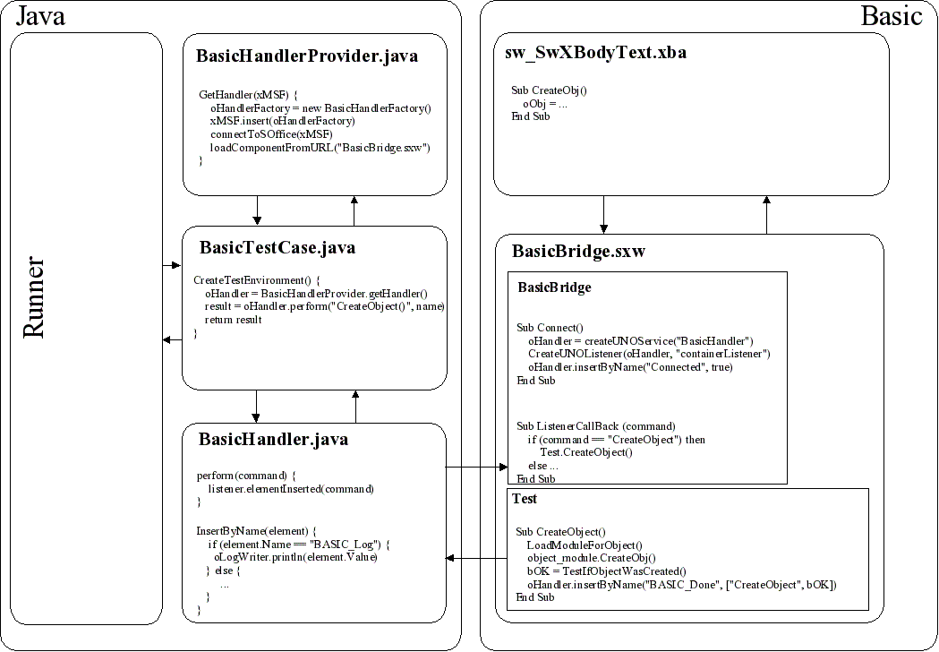 For the communication between Java and Basic, the BasicHandler is used. BasicHandler has its own factory called BasicHandlerProvider, which inserts it into the MultiServiceFactory of the Office. The Basic scripts in BasicBridge.sxw can create an instance from the MultiServiceFactory directly and call methods there, thus enabling the information flow from Basic to Java.